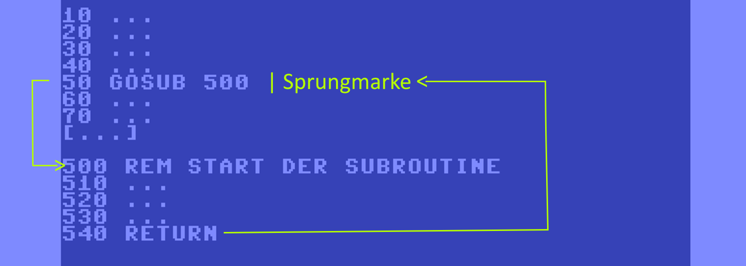 In Zeile 50 springen wir mit dem GOSUB Befehl in die Subroutine (Unterprogramm) ab Zeile 500. Dabei wird eine Sprungmarke direkt hinter dem GOSUB Befehl gesetzt.